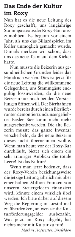 Hät­ten vor 20 Jahren nicht eine hand­voll kul­tur­in­ter­essiert­er Birs­felder für rund 2 Mil­lio­nen CHF das ROXY, mit­tler­weile unter Denkmalschutz, gekauft, ren­oviert und zum Kleinthe­ater umge­baut, stünde heute dort ein Wohn­block, oder eine Rei­he Rei­hen­häuser, oder ein Nacht­club mit den entsprechen­den Arbeits- und Neben­räu­men.