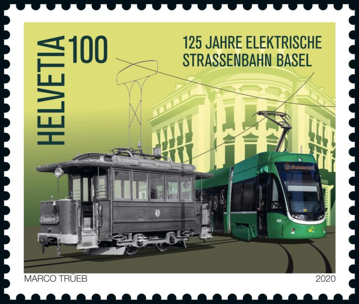 Die Briefmarke zeigt das allererste elektrische Tram Basels sowie das aktuell im Einsatz stehende Flexity Tram. Im Hintergrund ist das Gebäude des Bankvereins zu sehen. Dieses gibt es noch, die betreffende Haltestelle existiert ebenfalls bis heute. Sie war von Beginn an wichtig und wird aktuell von nicht weniger als sieben Linien, davon fünf der Basler Verkehrs- Betriebe (BVB), bedient.”