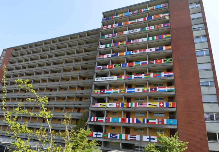 Das Foto (zVg von Kit­ty Schaert­lin) macht deut­lich, wor­um es Chris­toph geht. Im gros­sen Block woh­nen rund 15 ver­schie­de­ne Natio­nen — Chris­tophs Visi­on ent­hält so eine kla­re Bot­schaft.