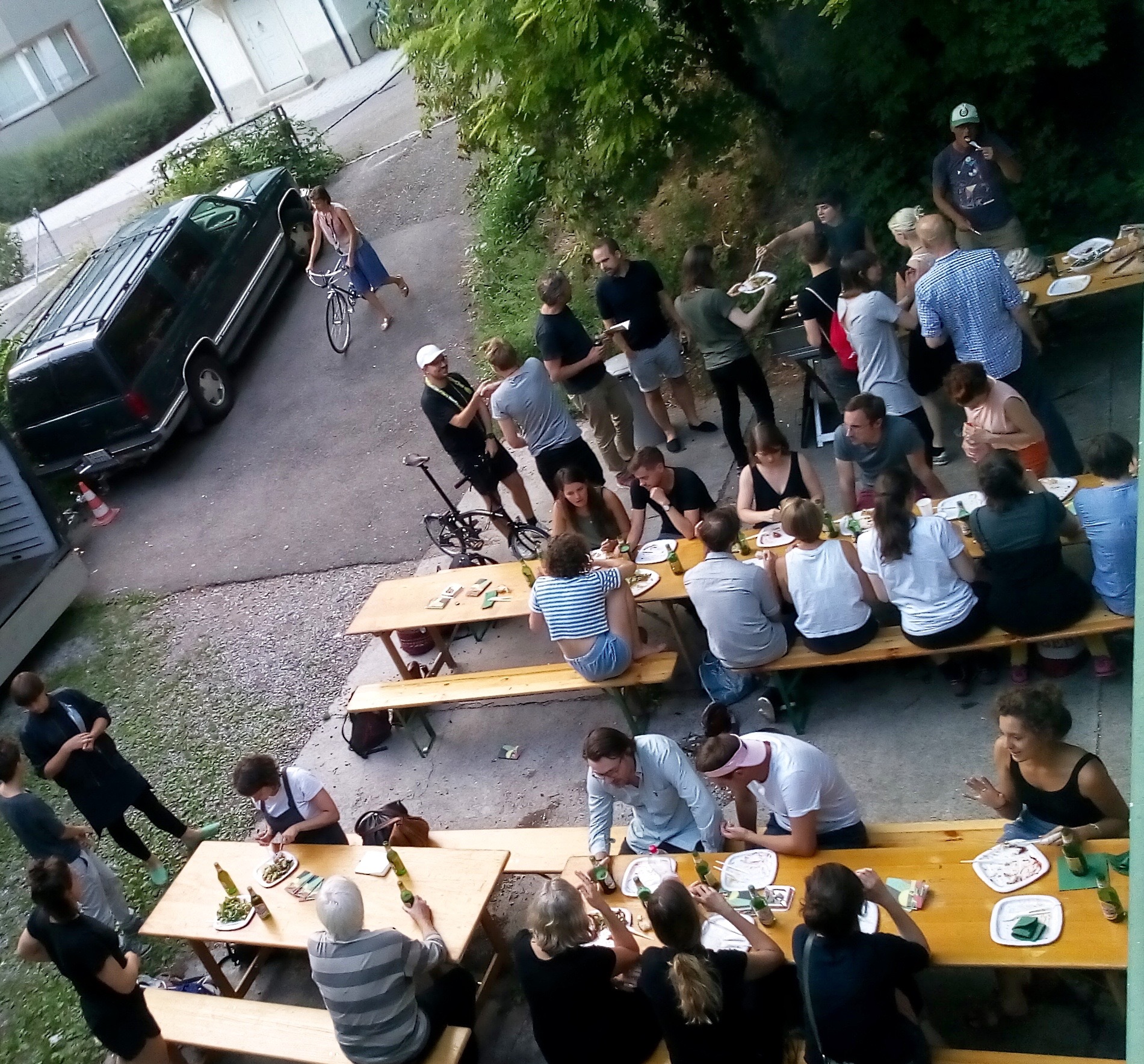 Sie feierten den Beginn der Basler Treib­stoffthe­atertage. Weil sel­bige in ver­schiede­nen “Häusern” stat­tfind­en, vielle­icht das einzige Mal, an dem alle Pro­tag­o­nis­ten zusam­men­sitzen. Und wo? Im ROXY.