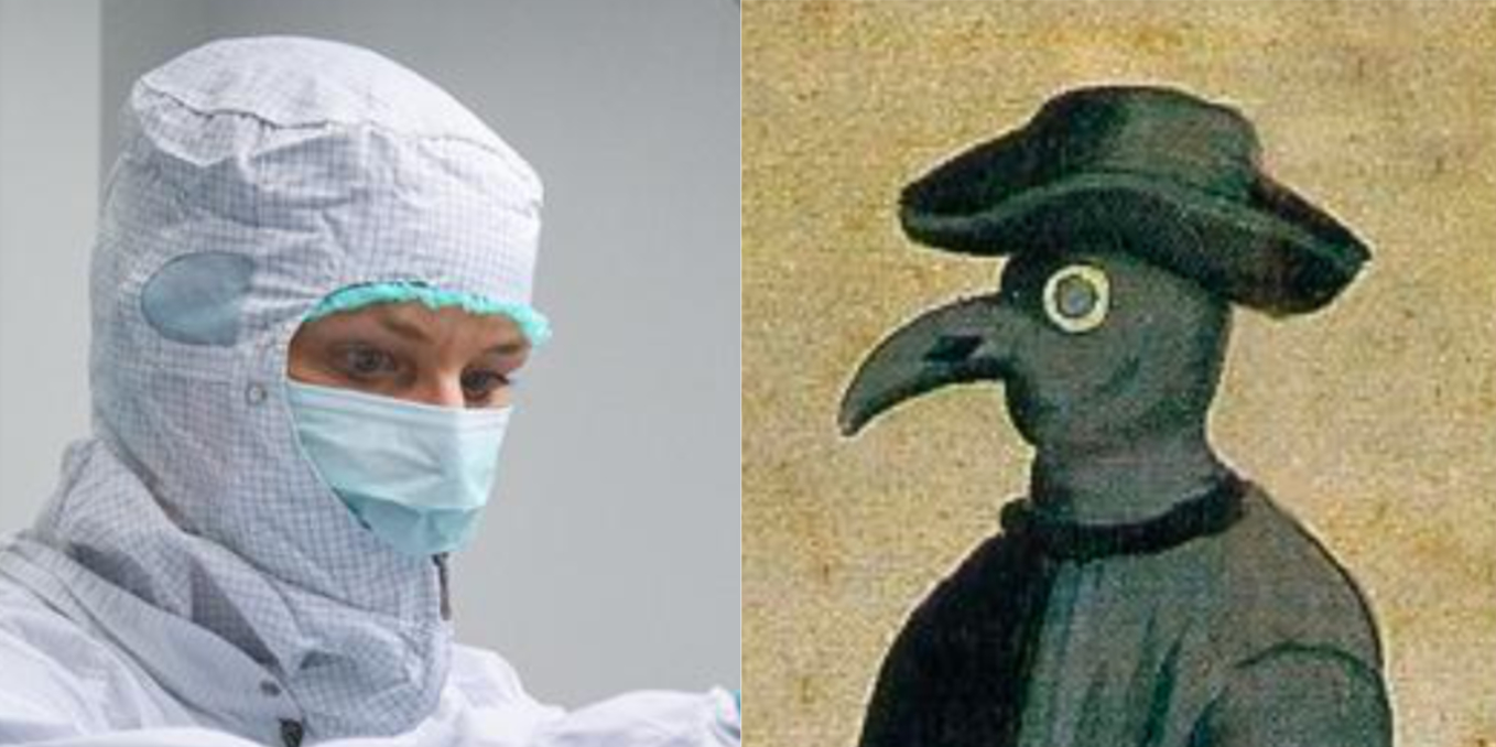 Und so schützen wir uns mit Masken, wie auch der Pestdoktor, der im Schnabel seiner Maske wohlriechende Kräuter oder mit Essig getränkte Schwämmlein hatte.