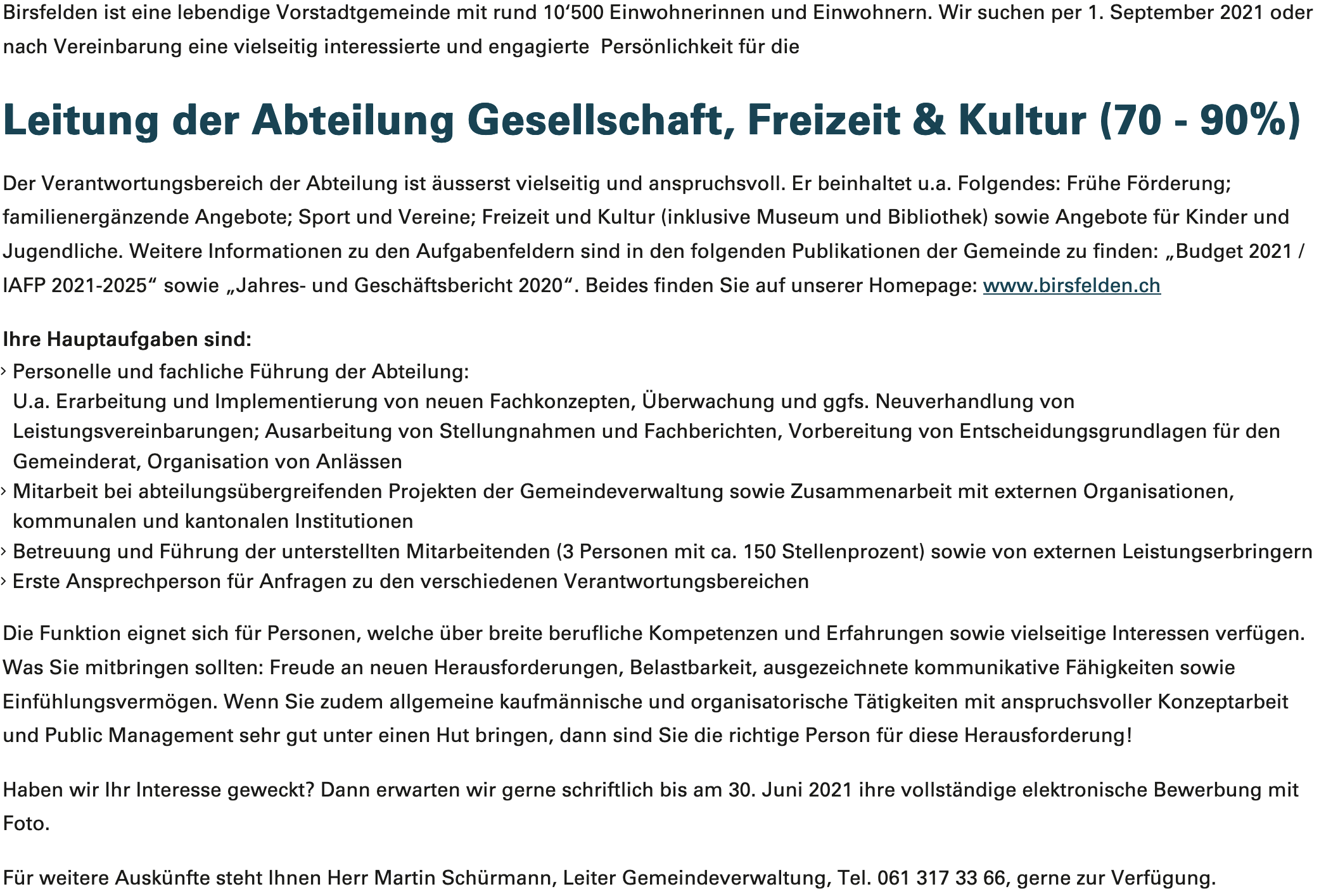 Stel­len­aus­schrei­bung Birs­fel­den