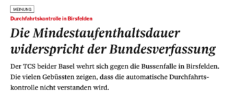 TCS-Sektionspräsident Christoph Haller ist frustriert und lamentiert in der BaZ: Autofahrerinnen und Autofahrer würden dank dem neuen Kontrollsystem in Birsfelden in ihrer Bewegungsfreiheit eingeschränkt. Dies widerspreche daher dem Artikel 10…