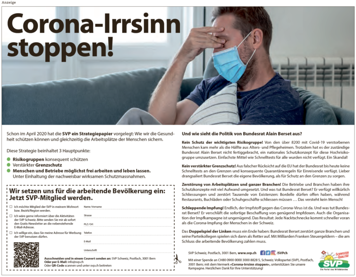 Alle Mass­nah­men und Nicht­mass­nah­men wer­den vom Bun­des­rat als Kol­le­gi­al­be­hör­de beschlos­sen, nicht von Herrn Ber­set. Und somit auch von der soge­nannt bür­ger­li­chen Mehr­heit im Bun­des­rat. Es ist schlicht und ein­fach »gschä­mig«, wenn die­se Par­tei nun ver­sucht die Schuld an einem Bun­des­rat fest­zu­ma­chen.