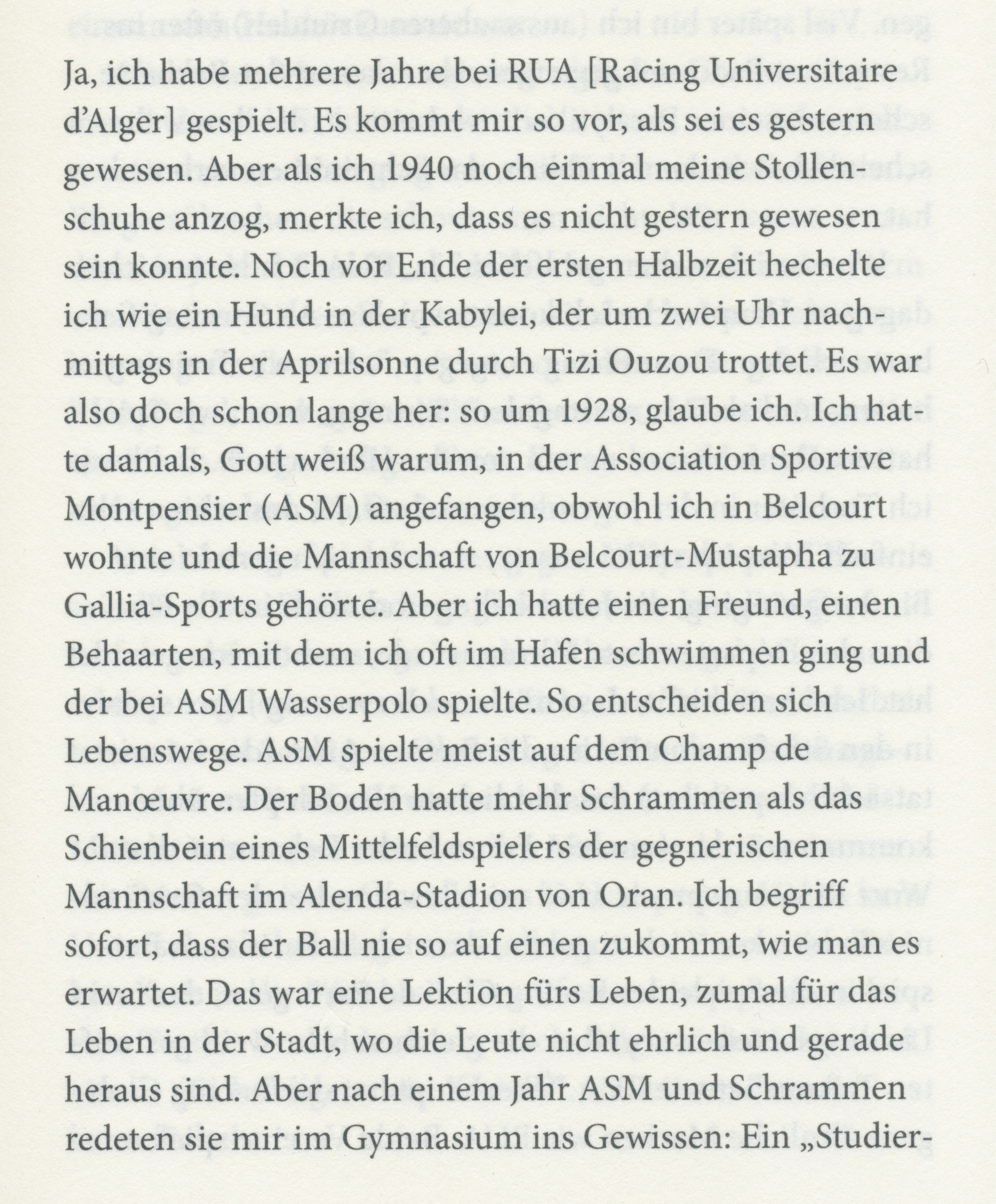 Als Alge­ri­en­fran­zo­se war das Fuss­ball­feld ein Manö­ver­platz, wenn nicht gar ein Schlacht­feld. Dar­über berich­tet Albert Camus, “France Foot­ball” 1957, über­sezt von Marie Loui­se Knott.