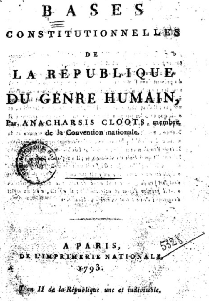Ein wei­te­rer Geehr­ter war der preus­sisch-nie­der­län­di­sche Johann Bap­tist “Anar­char­sis” Baron de Cloots, der auch in die Natio­nal­ver­samm­lung gewählt wur­de. 1793 ver­öf­fent­lich­te er die Schrift “Bases con­sti­tu­tio­nel­les de la Répu­bli­que du gen­re humain”, wor­in er fest­hielt, dass sich aus den Men­schen­rech­ten “die soli­da­ri­sche und unteil­ba­re Sou­ve­rä­ni­tät des Men­schen­ge­schlechts” erge­be. Sei­ner Ansicht nach hat­te die Revo­lu­ti­on einen uni­ver­sel­len Cha­rak­ter, wes­halb aus­ge­hend von Frank­reich eine Welt­re­pu­blik errich­tet wer­den sol­le. (…) Sou­ve­rä­ni­tät setz­te die Ver­ei­ni­gung der Men­schen in einer auf den Men­schen­rech­ten basie­ren­den, uni­ver­sel­len Gemein­schaft vor­aus. Dies sei auch mach­bar, wo doch alle die glei­chen Zie­le hät­ten, näm­lich Frei­heit, Gleich­heit, Sicher­heit, Gerech­tig­keit, Schutz des Eigen­tums, des Frie­dens und vor Unter­drü­ckung. Die kon­sti­tu­ti­ven Sub­jek­te der Welt­re­pu­blik kön­nen nach Cloots auf­grund der Unteil­bar­keit der Sou­ve­rä­ni­tät allein die Indi­vi­du­en sein. Im Mit­tel­punkt der Welt­re­pu­blik steht als Legis­la­ti­ve ein direkt gewähl­tes Par­la­ment. … Sei­nem Ent­wurf fol­gend schlug Cloots vor, Frank­reich mit einer neu­en Ver­fas­sung zu einer uni­ver­sel­len Repu­blik zu machen, der sich alle von der Mon­ar­chie befrei­ten Völ­ker als Dépar­te­ments anschlies­sen soll­ten.