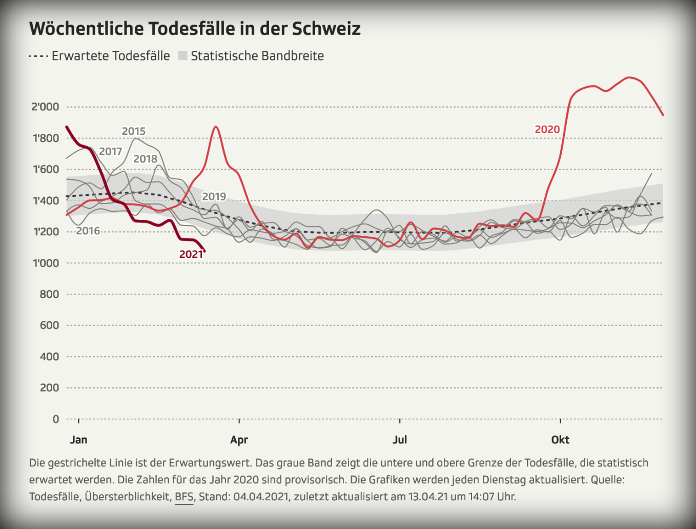 »Seit Mitte Februar sterben in der Altersgruppe von 65 Jahren und älter deutlich weniger Personen, als statistisch zu erwarten war. Es herrscht eine sogenannte Untersterblichkeit. Demnach starben bei den über 65-Jährigen in den letzten sieben Wochen, für welche Daten vorliegen, 1288 Menschen oder 15 Prozent weniger als erwartet. Das Bundesamt für Statistik sieht hauptsächlich zwei Erklärungen: Die Grippewelle ist diesen Winter ausgeblieben. Und ein Teil der Menschen, die in der zweiten Welle an Covid-19 gestorben sind, waren so alt und krank, dass ihr Leben nur um Wochen abgekürzt wurde.«