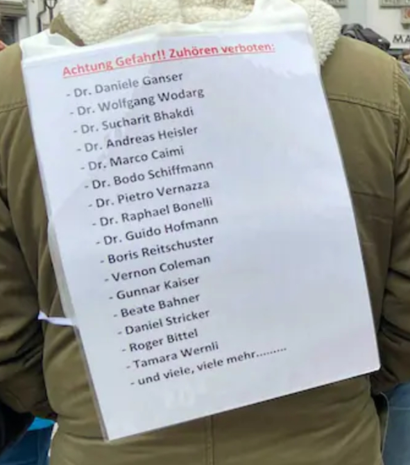 Plakat auf dem Rücken eines Demonstranten in Altdorf. Wenn nicht zuhören, dann vielleicht lesen — aber nur wenn Sie nicht faktenresistent und wissensresistent sind.