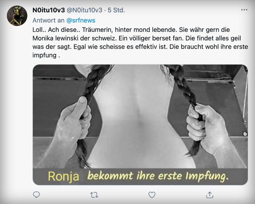 Ausfluss davon war eine engagierte Disskussion auf twitter. Mehr oder weniger gut, aber immer im Rahmen des Erträglichen. Ronja Jansen, die sich sehr heftig für die Jungen einsetzte, bekam wieder einmal die Vision eines wohl eher rechts stehenden, tapferen Mannes ab: