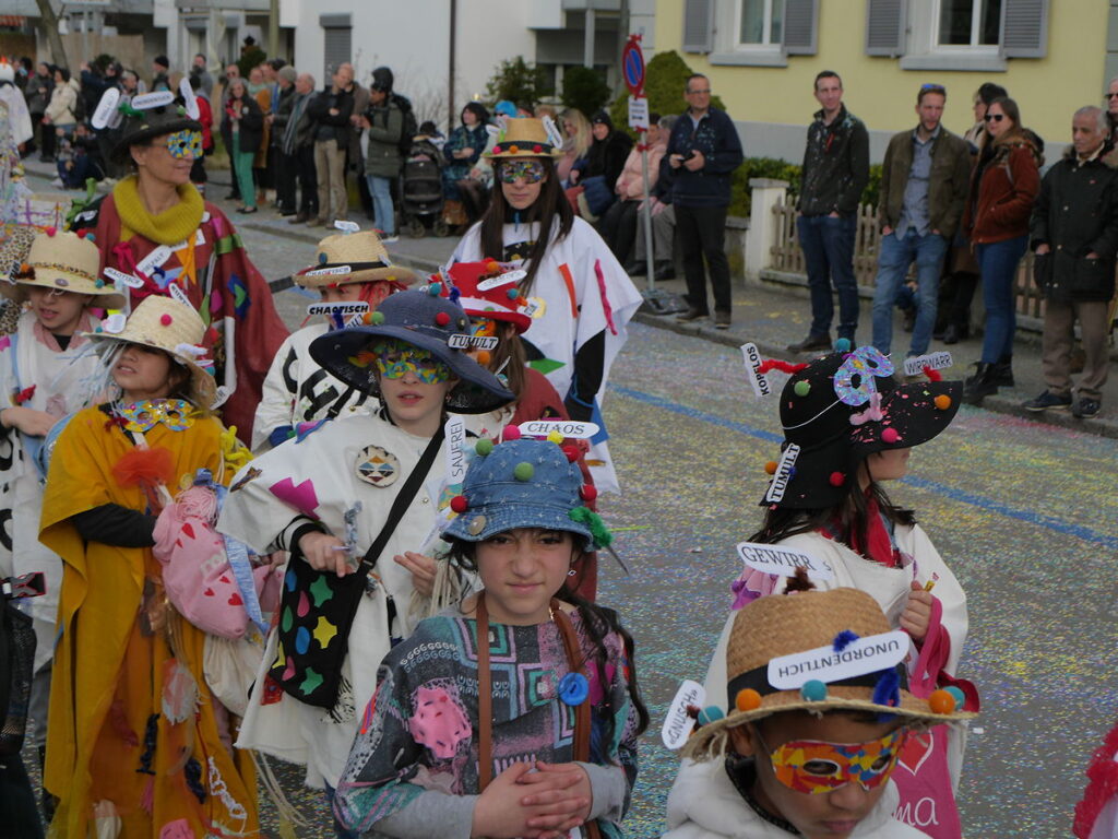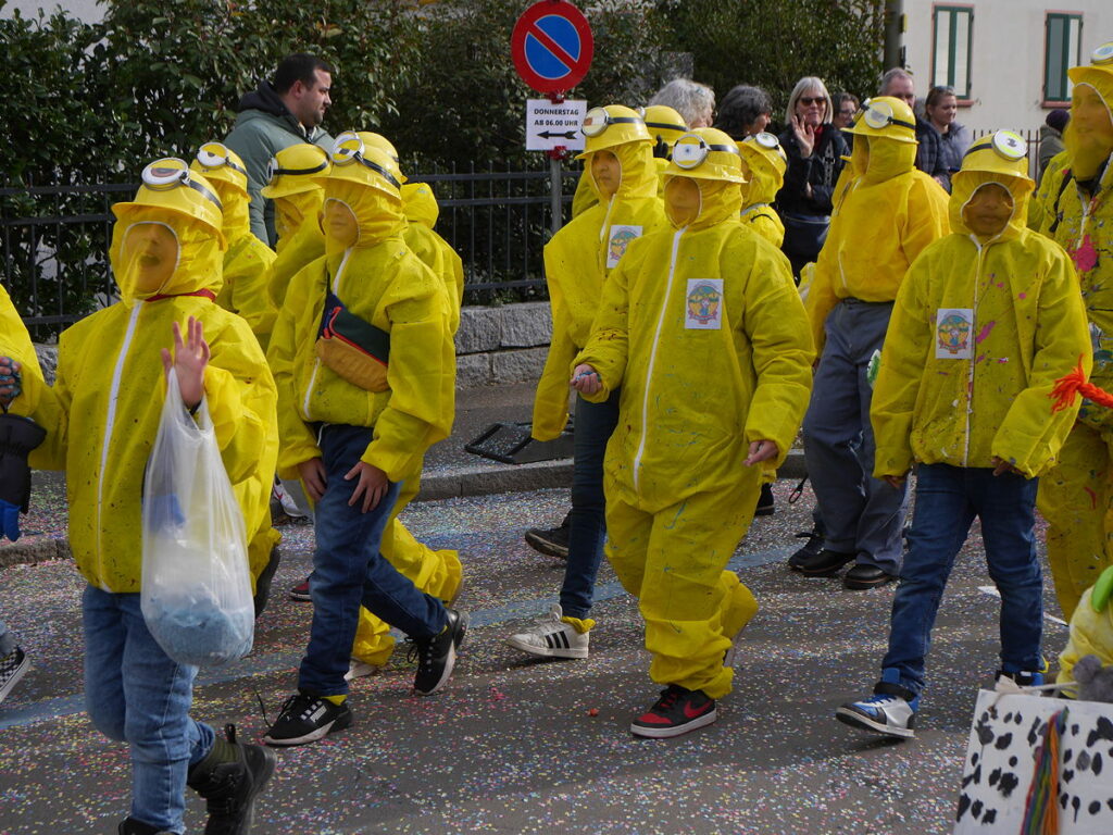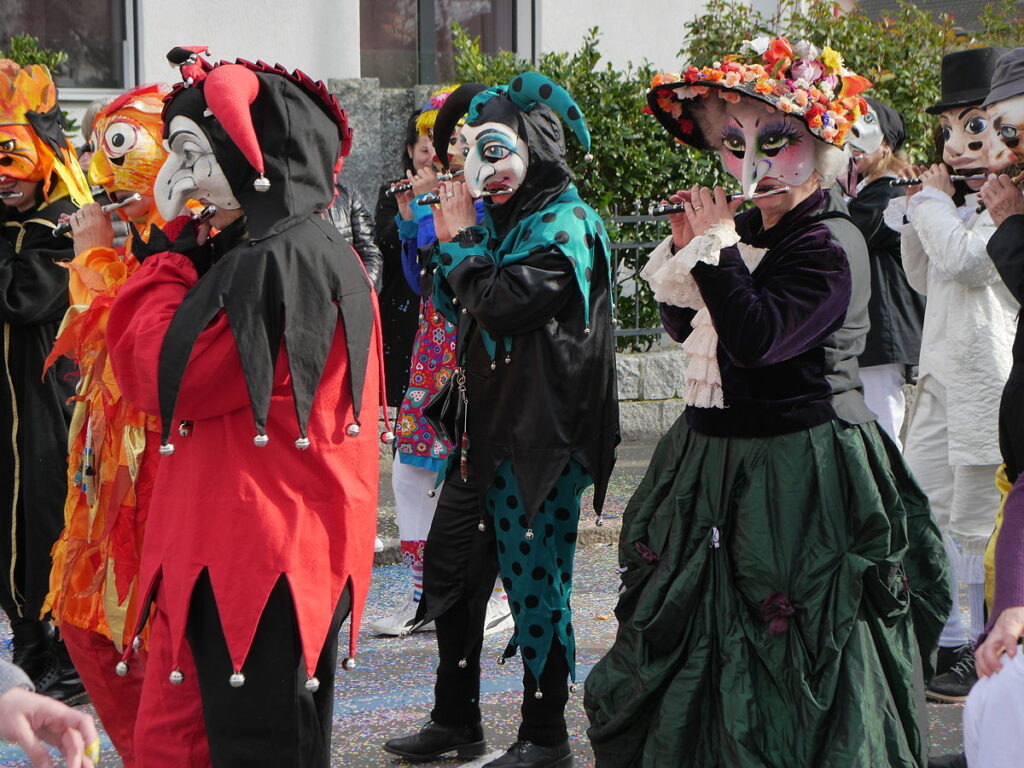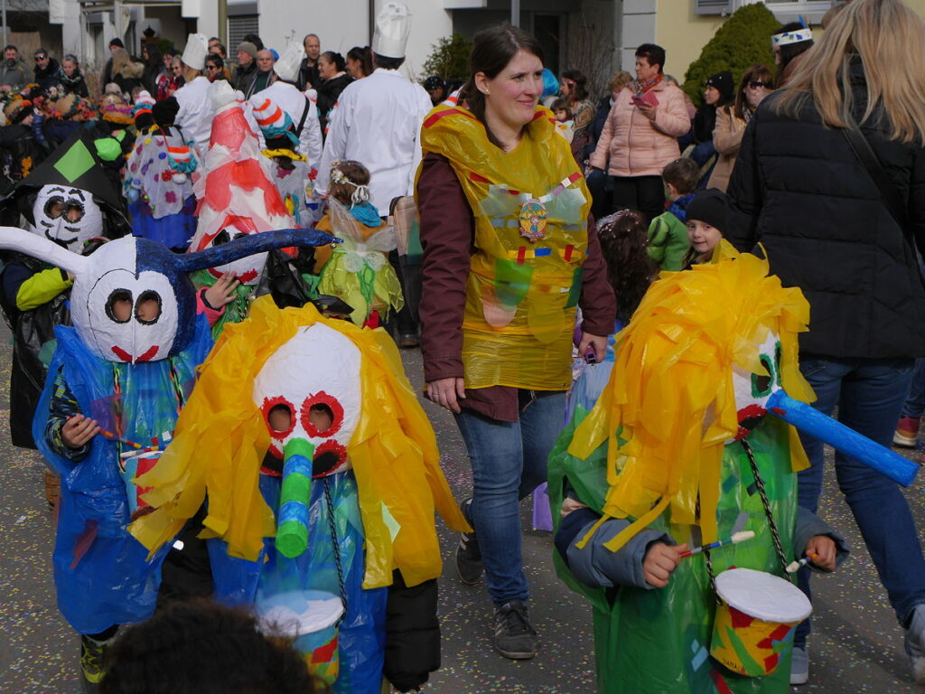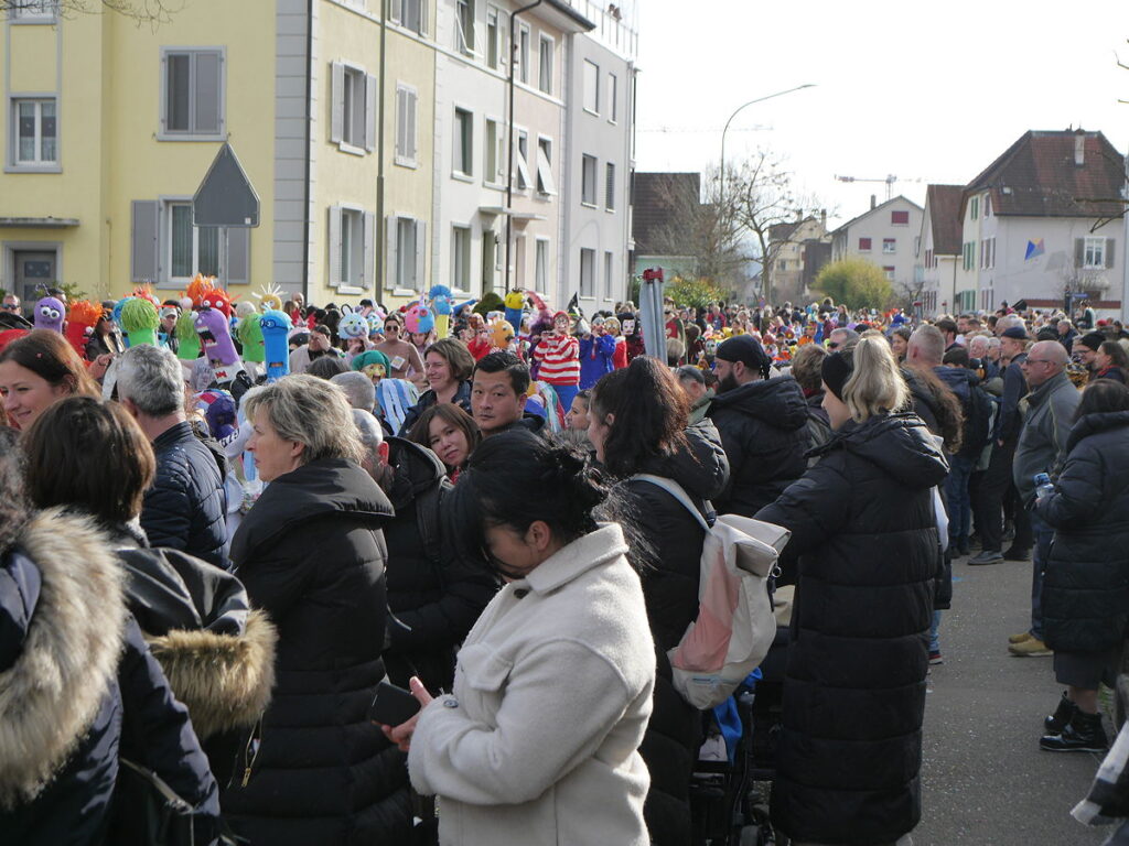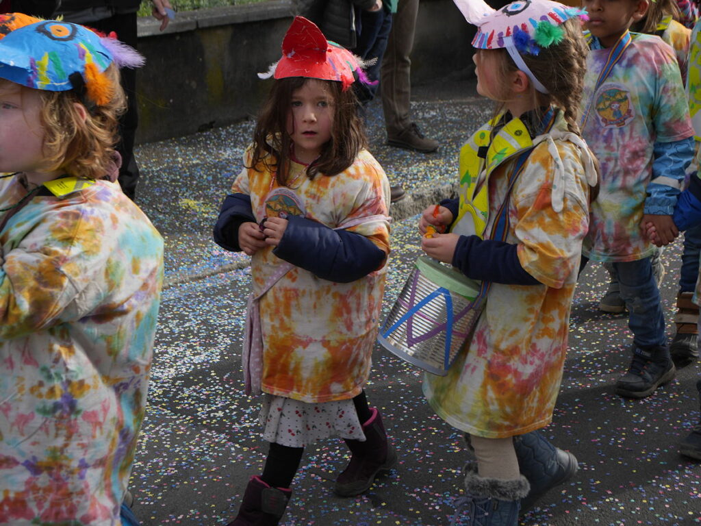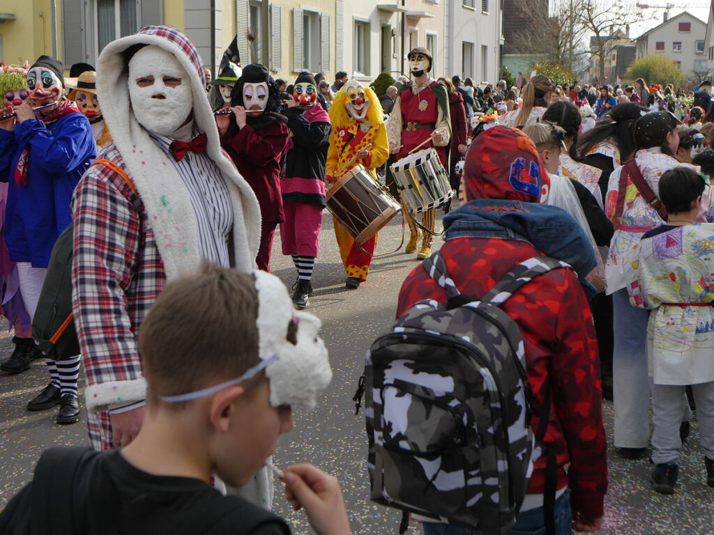 Auf dem Pausenplatz des Scheuerrain-Schulhauses stehen ein paar Dutzend Festtische — was tut sich da? Pfeifen und Trommeln in der Wartenbergstrasse machen schnell klar: Die Birsfelder Kindergärten und Primarklassen machen bei schönstem Wetter ihren grossen Fasnachtsumzug 🙂 . Und das Publikum ist in Scharen herbeigeströmt!