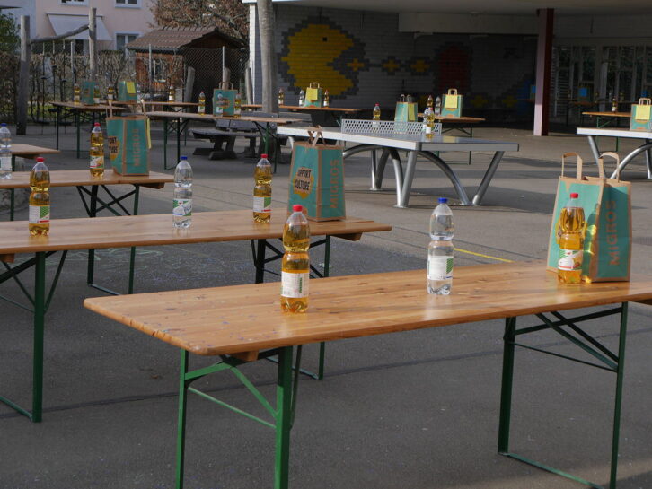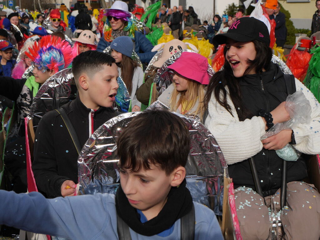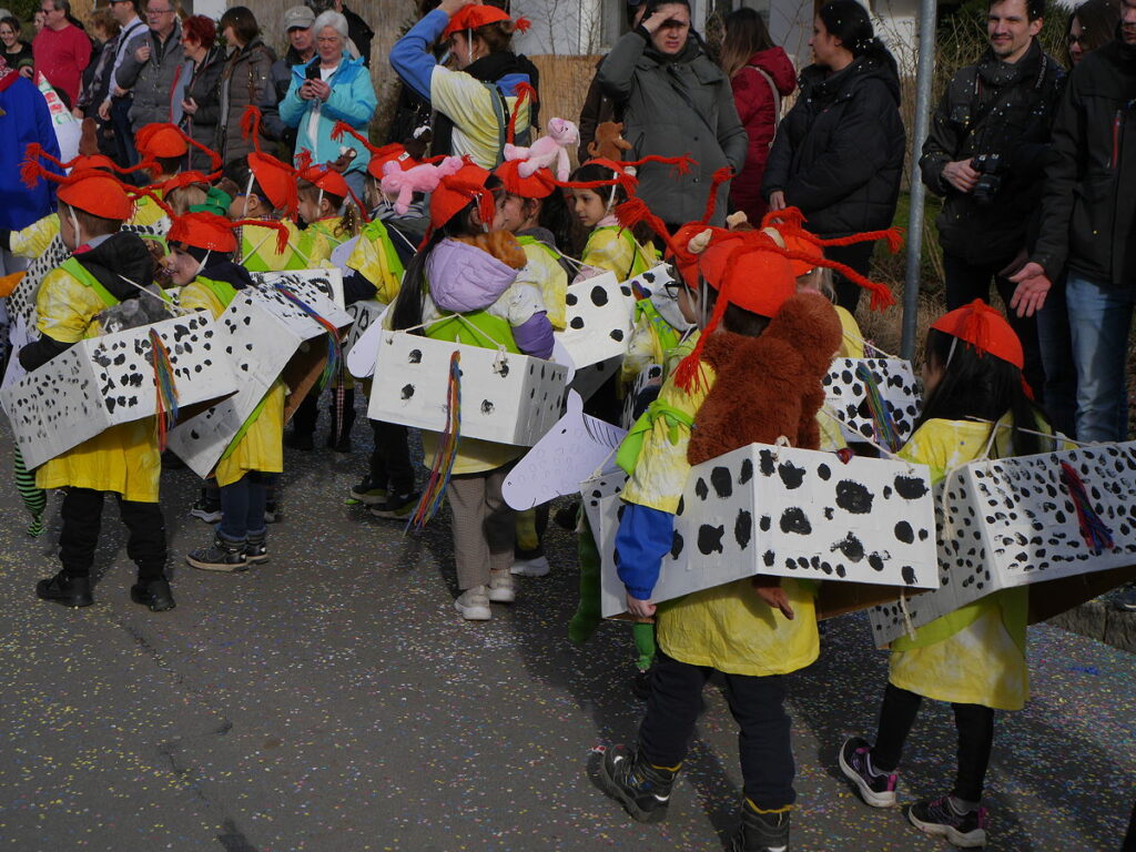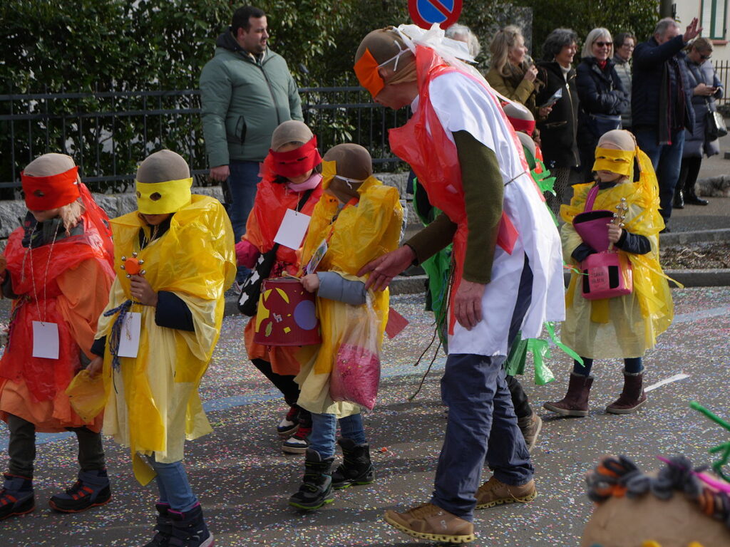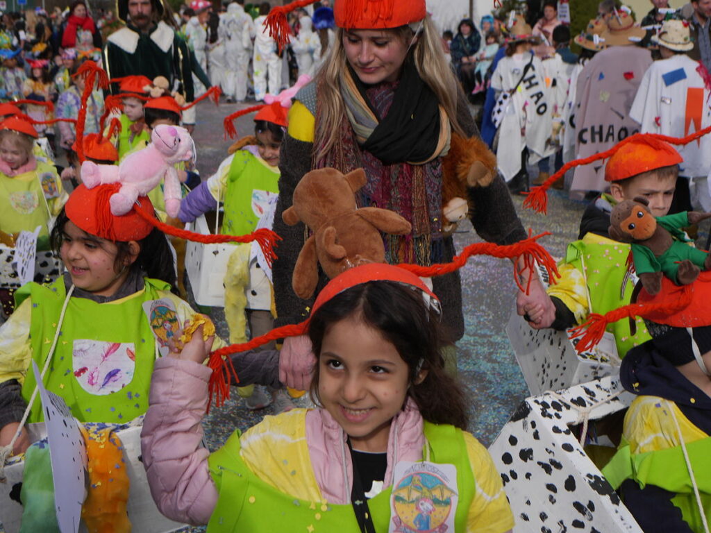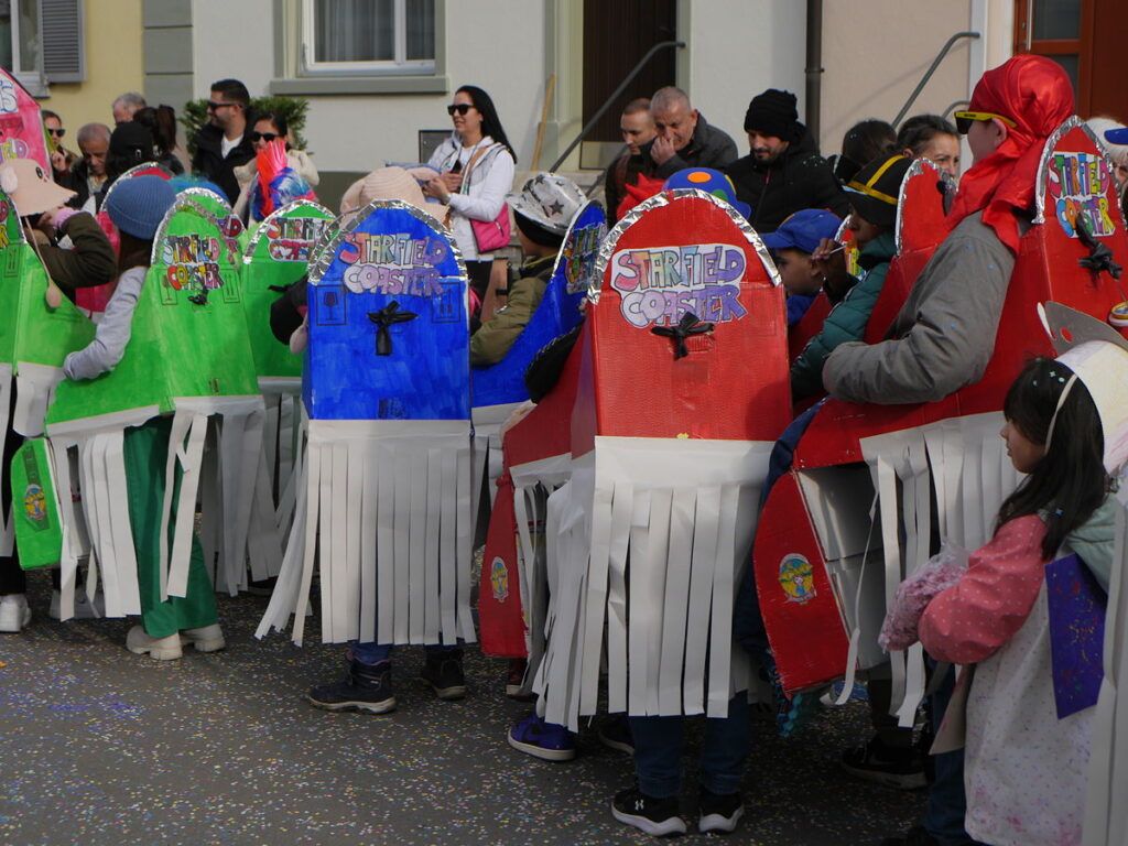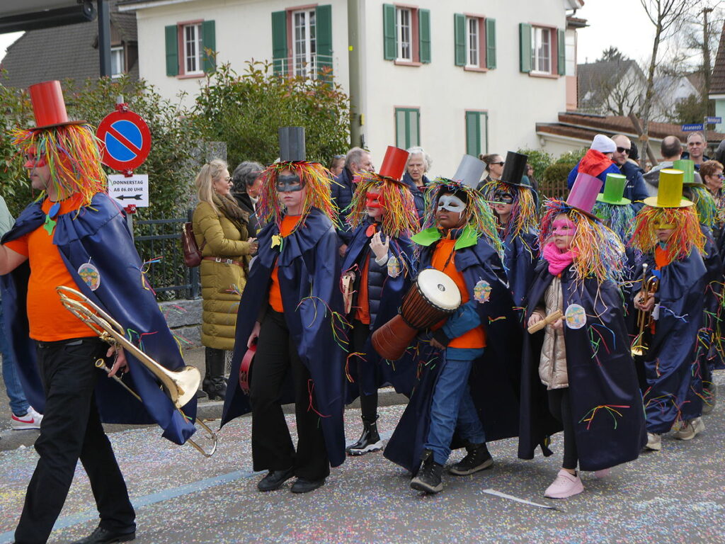 Auf dem Pausenplatz des Scheuerrain-Schulhauses stehen ein paar Dutzend Festtische — was tut sich da? Pfeifen und Trommeln in der Wartenbergstrasse machen schnell klar: Die Birsfelder Kindergärten und Primarklassen machen bei schönstem Wetter ihren grossen Fasnachtsumzug 🙂 . Und das Publikum ist in Scharen herbeigeströmt!