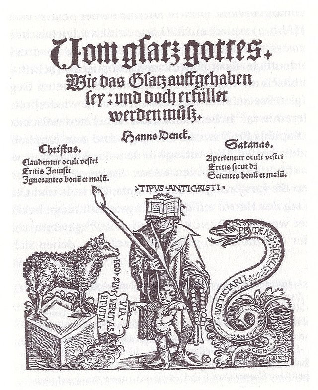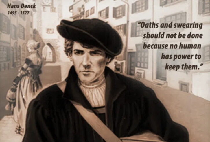 Im November 1527 starb in Basel ein junger Flüchtling an der Pest, je nach Quelle 27 oder 32 Jahre alt. Er war seit Jahren im Deutschen Reich und in der Eidgenossenschaft unterwegs gewesen: Augsburg, Regensburg, Basel, Nürnberg, St. Gallen, Strassburg, Worms, Konstanz, Ulm, Zürich, Schaffhausen … Dieses stetige Umherziehen war allerdings nicht seinem Wandertrieb oder seiner Abenteuerlust geschuldet. Hans Denck gehörte zu einer Gruppe, deren Mitglieder damals überall verfolgt und oft getötet wurden, weil ihre Ansichten über das wahre Leben und Denken eines Christen diametral mit der herrschenden lutheranischen und zwinglianischen Orthodoxie zusammenstiessen: die Täufer. Diesen Namen erhielten sie wegen ihrer Lehre, dass der Entscheid, Jesu Christi nachzufolgen, nur von selbständig Denkenden, also Erwachsenen, getroffen werden könne und erst dann eine Taufe Sinn mache.