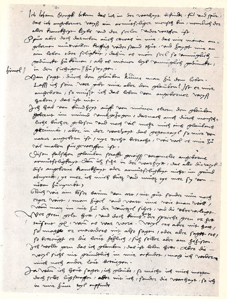 “In seinen “Hauptreden”, einer 1528 posthum veröffentlichten kurzen Abhandlung, setzt sich Denck mit dem Problem des Verhältnisses von Einheit und Vielheit auseinander. Er betont die Einheit Gottes. Alle Einigkeit habe ihren Ursprung in Gott, der als „das Eine“ aller Zweiheit und damit aller Zwietracht entgegenstehe. Alles Erschaffene müsse auf das Einige hin erschaffen sein, anderenfalls gäbe es keine Ordnung. Jedes Geschöpf sei ein „Gegenwurf“ des Einen und biete als solcher Gelegenheit, das Eine zu erkennen. In erster Linie gelte dies für den Menschen als vernunftbegabtes Wesen. Die Bestimmung des Menschen sei es, von allem „Gezweiten“ – der Entzweiung – in das Einige zurückzukehren. Dies könne nur dadurch geschehen, dass man all das, was „dem Einen zuwider ist“, aufgebe. Da alle Uneinigkeit auf Ungleichheit im Willen beruhe, komme es nur darauf an, Einheit zwischen dem göttlichen und dem menschlichen Willen herzustellen. Darin bestehe die Gelassenheit. Diesen auf einem freien menschlichen Willensakt beruhenden Prozess fasst Denck als Vergottung des Menschen auf.” (Wikipedia)