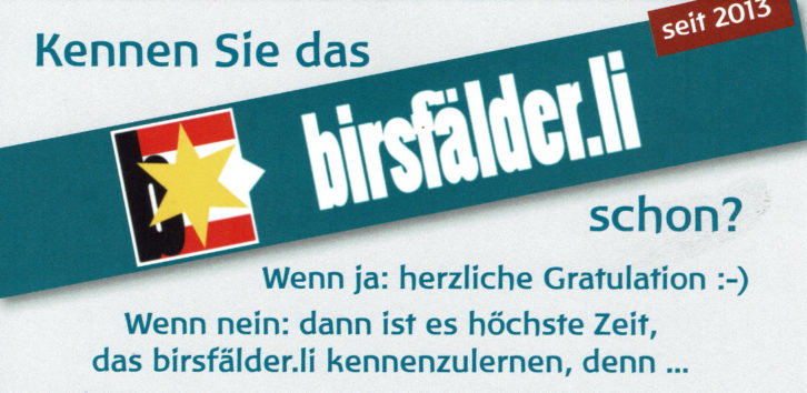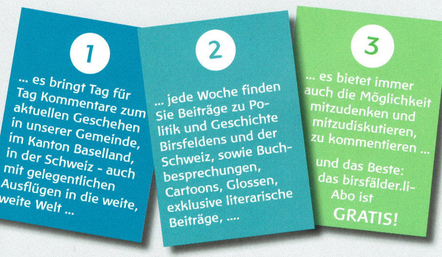 Das „birsfälder.li“ erhalten Sie, falls gewünscht gratis, das bedeutet:100% „birsfälder.li“ mit einem Rabatt von 100%. Dazu garantiert ganz ohne kommerzielle Werbung. Darum der ausführliche Vorspann zu diesem Beitrag.