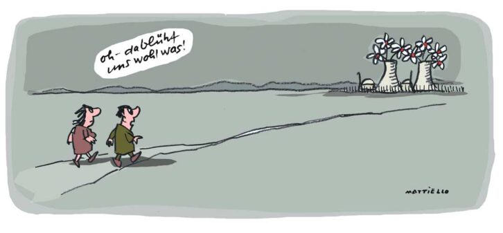 Schang Hutter über Mattiello: »Über den Wert einer Zeichnung entscheidet die Lesbarkeit der Mitteilung. Mattiello zeichnet Erlebnisse und Zustände unserer Gesellschaft kritisch und klar ablesbar, er ist Zeichner für die anderen. Er will zeichnen, weil er etwas zu sagen hat.«