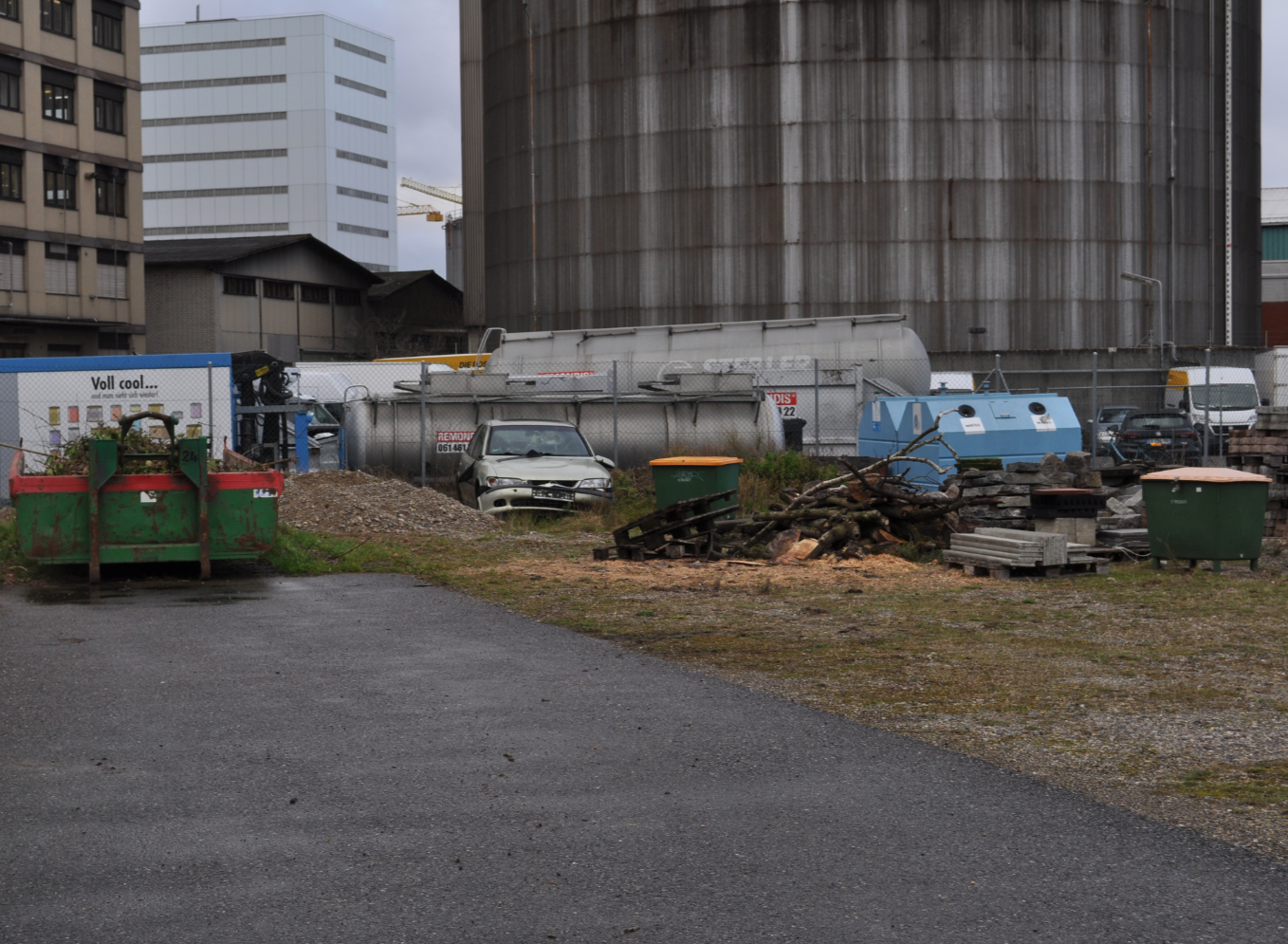 Ein Bijou der Son­derk­lasse haben wir an der Hafen­strasse Num­mer 18 angetrof­fen. Die idyl­lisch anmu­tende 562 m² grosse Parzelle gehört offen­sichtlich der Ein­wohn­erge­meinde Birs­felden. Die Gemeinde hält sich hier ein kleines Not­fal­l­lager, beste­hend aus ver­schiede­nen kleineren Kies‑, Sand- und Stein­haufen, ein paar alten Wasser­rohren und einem alten zerdep­perten Auto, vielle­icht ein Fig­u­rant der Feuer­wehr.
