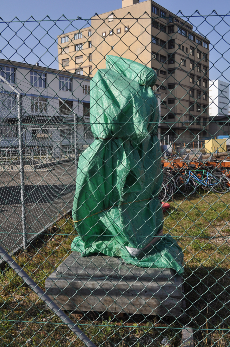 Und ganz links vorne in der Ecke ste­ht noch ein ganz spezielles Bün­del. Auf dem Sock­el unten ist zu lesen: C. Gutknecht 1963. Es sind die zwei nack­ten Jünglinge mit Pfeil und Bogen, die bis vor kurz­er Zeit beim Schul­haus Birs­matt ges­tanden sind. Die Anlage sieht nicht nur leicht ver­wun­schen, son­dern auch vergessen aus. Sie soll der Ein­wohn­erge­meinde gratis zugeschla­gen wor­den sein. Zumin­d­est taucht das Are­al in der Buch­hal­tung nicht auf.