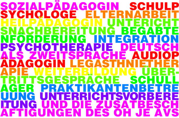 Die heutige Schul­re­al­ität gestal­tet sich etwas anders und ist unter anderem dadurch gekennze­ich­net, dass immer mehr Auf­gaben neben dem eigentlichen Unter­richt zu bewälti­gen sind: mehr Tea­mar­beit, mehr Absprachen mit Förder­lehrkräften und Ther­a­peutin­nen, mehr Pla­nungssitzun­gen, mehr Arbeits­grup­pen, mehr Kon­vente, mehr verord­nete Weit­er­bil­dun­gen, mehr Admin­is­tra­tion, mehr Elternar­beit, umfassendere Beurteilun­gen.