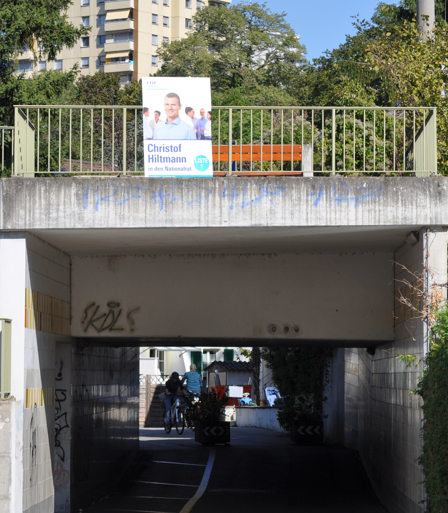 Bei öffentlichen Gebäu­den habe ich keine Rekla­men fest­gestellt, auss­er die Umzäu­nun­gen der Schul­häuser gehörten auch zu den öffentlichen Gebäu­den. Bei den Brück­en wird es in der Beurteilung schon heik­ler. Würde ein Plakat, das auf der Basler Seite ein­er Brücke hän­gen würde, auch ent­fer­nt? Ich habe keines gese­hen. Allerd­ings auf der Brücke, die die Strasse »Im Lerchen­garten« über­quert hängt eines — oder ist dies keine Brücke?