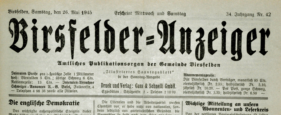 Am 5. April 1945, vor 70 Jahren, wurde der Birsfelder Anzeiger zum »Amtsblatt« erkoren oder befördert. Er durfte nun im Titel die Formulierung »Amtliches Publikationsorgan der Gemeinde Birsfelden« tragen. Die amtlichen Mitteilungen wurden zwar schon lange vorher immer publiziert – aber eben nicht amtlich.