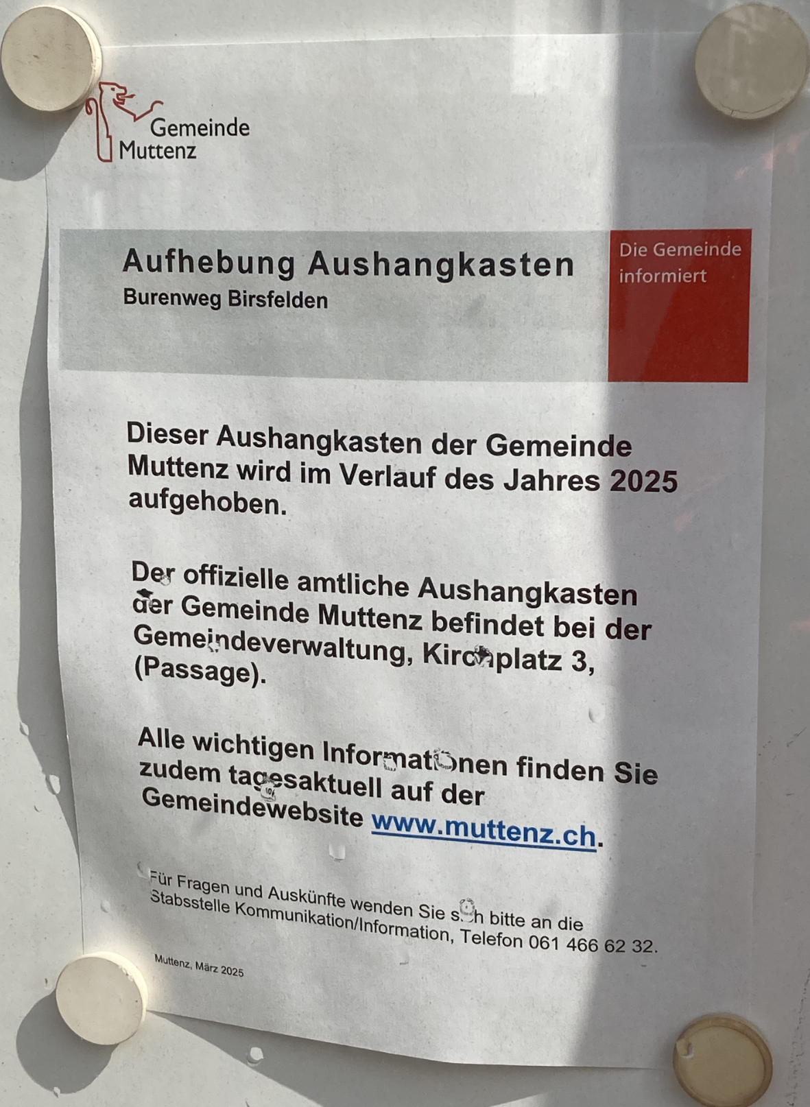 Nimm dir kein Beispiel an der Gemeinde Muttenz, lass deine Aushangkasten stehen, sie werden beachtet.