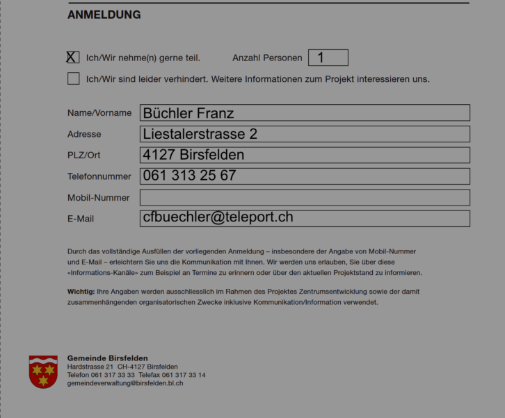 Die Anmeldeformulare können auf der Gemeindewebsite geholt werden oder werden sicher auch noch im Birsfelderanzeiger erscheinen.