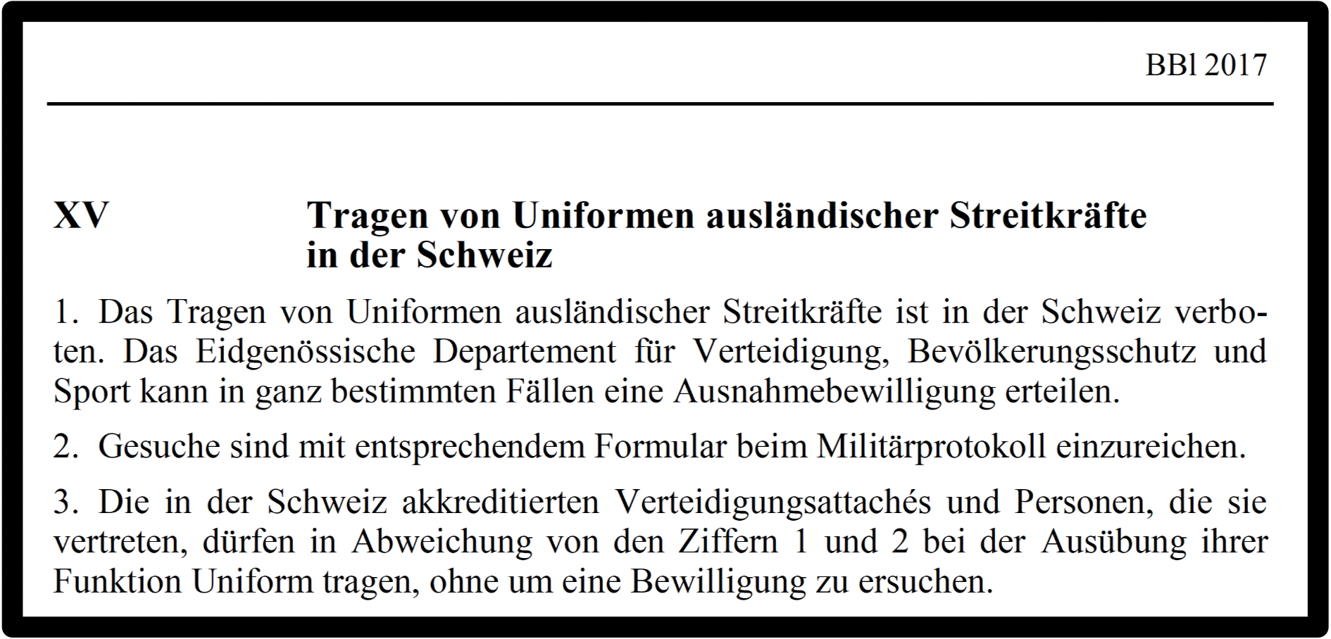 Jetzt frage ich mich, warum eigentlich in der Berichterstattung damals niemand auf das Verbot des Tragens ausländischer Uniformen hingewiesen hat, denn die Verordnung über das Tragen ausländischer Uniformen in der Schweiz regelt das ganz klar!