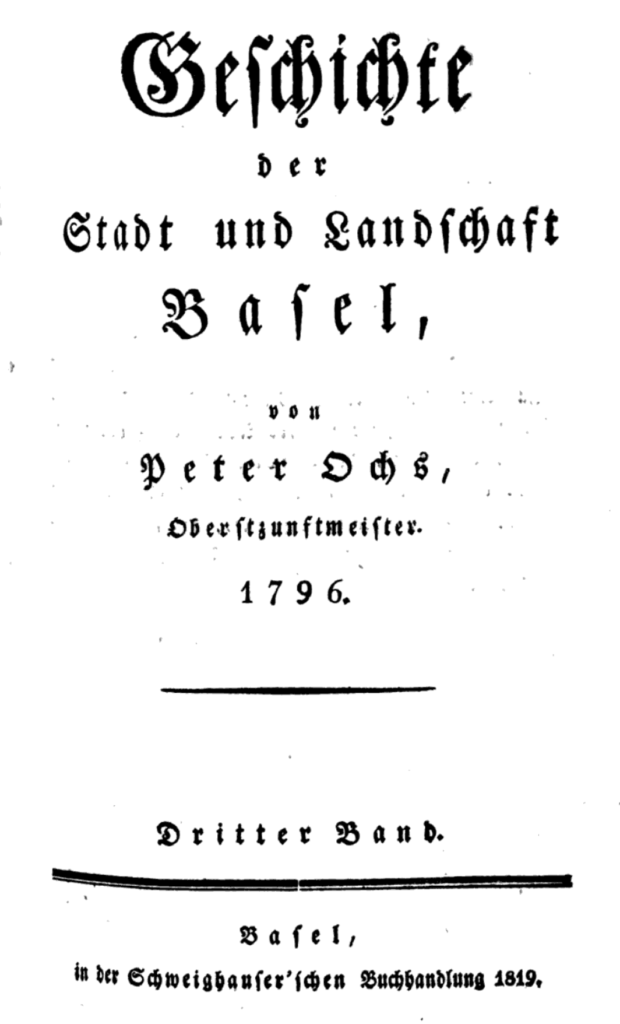 Er musste schliesslich 1819 aber doch bei Schweighauser in Basel drucken lassen und die “freundschaftliche” Durchsicht des Manuskripts durch Bürgermeister Wieland hinnehmen, weil diesem die Druckerei gehörte. Als klar wurde, dass die Revolutionsgeschichte nicht mehr zu seinen Lebzeiten erscheinen würde, sicherte Ochs sich ab und schickte Paul Usteri (einem Freund in Zürich) im Februar 1821, wenige Monate vor seinem Tod, eine eigenhändige Abschrift. …