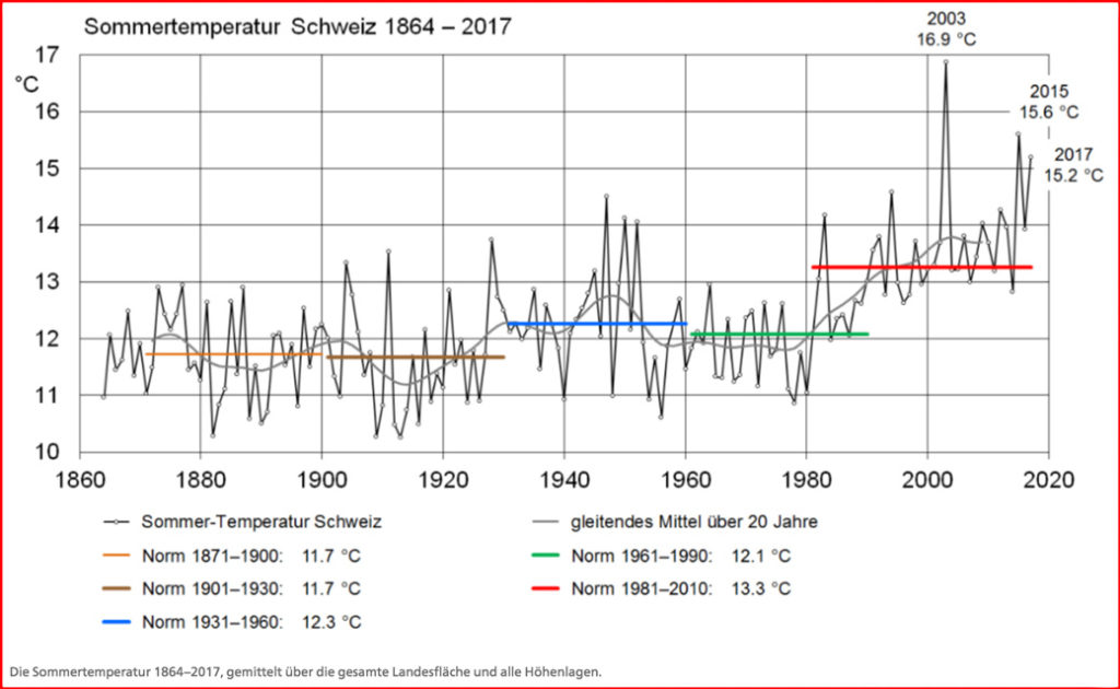 Dass der Kan­ton oder gar der Bund in unse­rer Gemein­de in Sachen ther­mi­schem Kom­fort etwas unter­nimmt, ist sicher illu­so­risch. Und damit klar ist über was wir nach­den­ken soll­ten, hier die gemit­tel­ten Som­mer­tem­pe­ra­tu­ren seit 1864:
