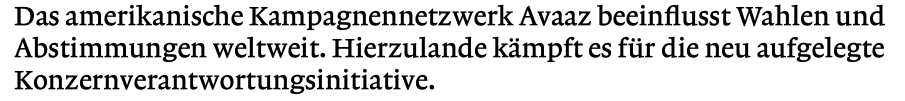 Die Avaaz-Gemeinschaft führt Kampagnen in 17 Sprachen durch, unterstützt von einem Kernteam, das auf 6 Kontinenten verteilt ist, und Tausenden von Freiwilligen. Unser Einsatz ist vielfältig: Wir unterzeichnen Petitionen, finanzieren Medienkampagnen und Protestaktionen, treten durch E‑Mails und mit Anrufen in Kontakt mit Regierungen und organisieren “offline” Proteste und Veranstaltungen — um sicherzustellen, dass die Ansichten und Werte der Menschen auf der ganzen Welt in die Entscheidungen einfließen, die uns alle betreffen (aus der Avaaz-Website)