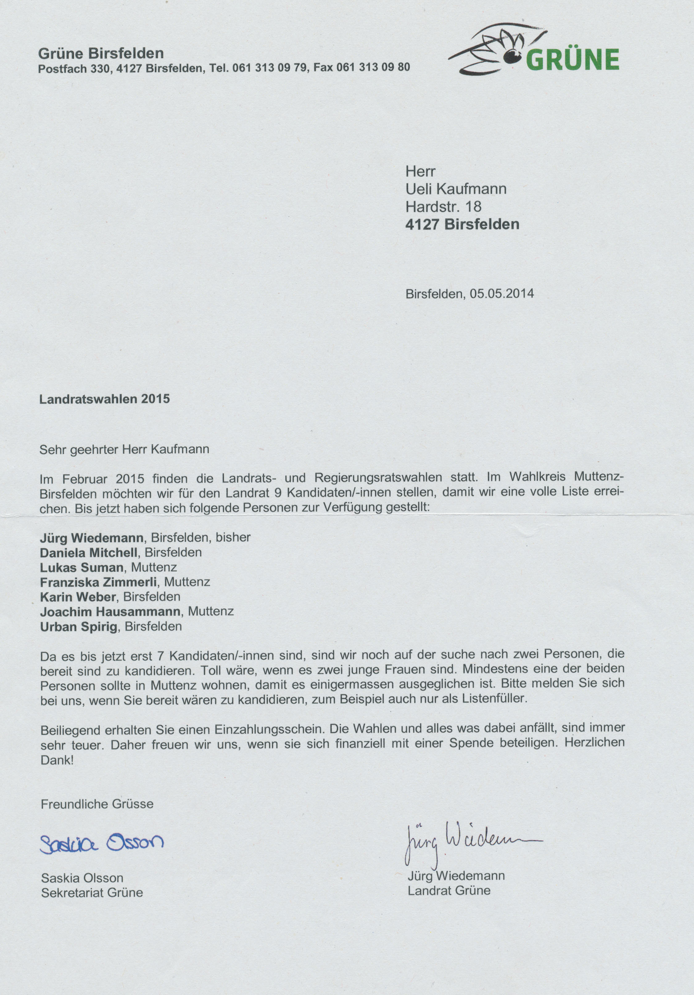 Ich erin­ne­re mich an mei­ne Zeit im Land­rat. Mit Klaus Hilt­mann (CVP), Mar­got Hun­zi­ker (SP), Ueli Kauf­mann (SP), Wer­ner Vögt­li (FdP), Doro­thée Wid­mer (Grü­ne) bil­de­ten wir im Land­rat eine Birs­fel­der Con­nec­tion, die sich vor Birs­fel­den betref­fen­den Ent­schei­dun­gen durch­aus häu­fig und respekt­voll unter­ein­an­der absprach, oft muss­ten ein­zel­ne über den Schat­ten der eige­nen Par­tei sprin­gen, zu Guns­ten Birs­fel­dens. Nie­mand der fünf Land­rä­te war im Gemein­de­rat, nicht zuvor und nicht danach. Ämter­ku­mu­la­ti­on war in allen Par­tei­en ver­pönt.