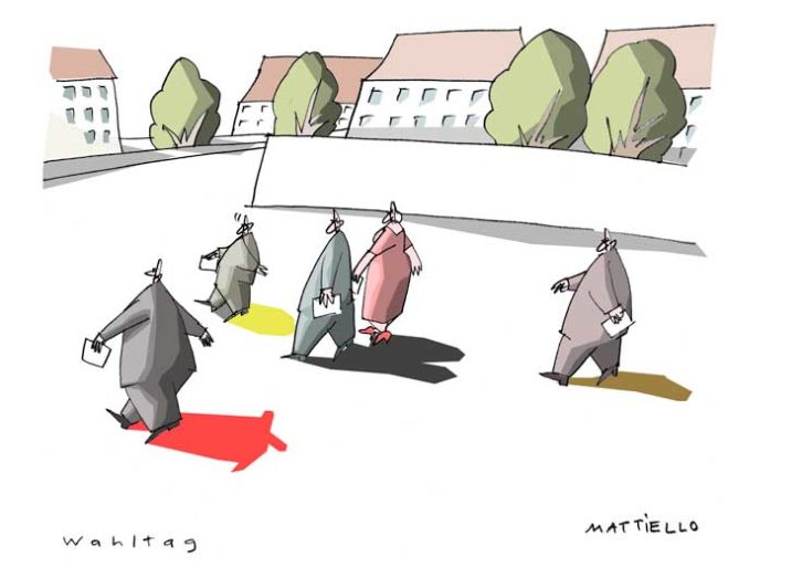 Nun, an die Bundesratswahl am Mittwoch hat wohl der Zeichner nicht gedacht, sondern eher an die Wahlen im grossen Kanton, nördlich vom Rhein am nächsten Sonntag. Da laufen die liberalen, linken und katholischen Wähler voran, der braune faschistische Mist hinkt hinterher.