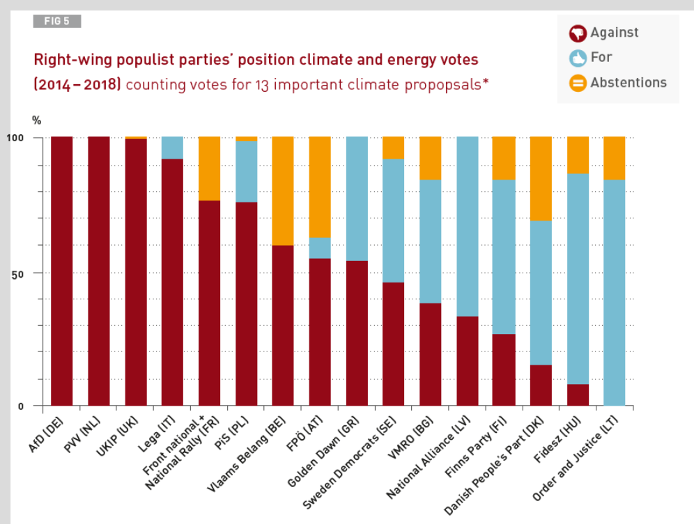 Hier ein Bild, das mich nach­denk­lich stimm­te. Lei­der weiss ich nicht mehr, auf wel­cher Inter­net­sei­te ich dar­über gestol­pert bin. Es soll die Posi­ti­on der rechts­po­pu­lis­ti­schen Par­tei­en bei Kli­ma- und Ener­gie­ab­stim­mun­gen in der EU zei­gen. Dies anhand von 13 wich­ti­gen Kli­ma­schutz­vor­schlä­gen.