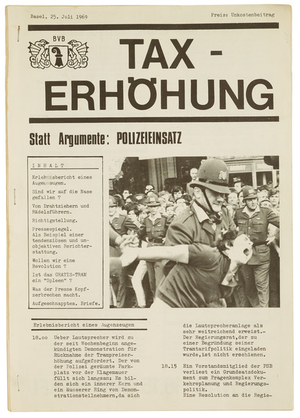 “Für den 1. Juli 1969 organisierten die Progressiven Studenten, Schüler und Lehrlinge auf dem Barfüsserplatz einen Sitzstreik gegen eine Tram-Tariferhöhung. Die Demonstranten setzten sich auf die Tramschienen und blockierten zur Hauptverkehrszeit den Tram- und teilweise auch den Autoverkehr. Die friedlich verlaufenden Proteste wiederholten sich während der folgenden Tage. Am 8. Juli beschloss der Regierungsrat, keine weiteren Verkehrsbehinderungen mehr zu dulden. Am 18. Juli 1969 kam es zu einem Grosseinsatz der Polizei mit 180 Mann. Die Zeitung der Progressiven Studentenschaft Basel vom 25. Juli 1969 dokumentiert die Ereignisse rund um den Polizeieinsatz aus Sicht von Betroffenen und Augenzeugen. Unter Schlagzeilen wie „Tränengas statt Diskussion“ wird in einem liveticker berichtet, wie die Spirale der Polizeigewalt eskaliert: „23.00 …Manifestanten werden zum Mannschaftswagen geschleift… Beim Wagen angelangt wird das schlaffe Stück Fleisch mal hübsch heraufgereicht, von zwei auf der Ladebrücke stehenden bulligen Kerlen dezidiert behändigt. Kurzer Anlauf und hau ruck! Lustvoll verzerrt die martialisch bebrillt und behelmten Gesichter, wenn die Körper an der Fahrerkabine aufkrachen.“…