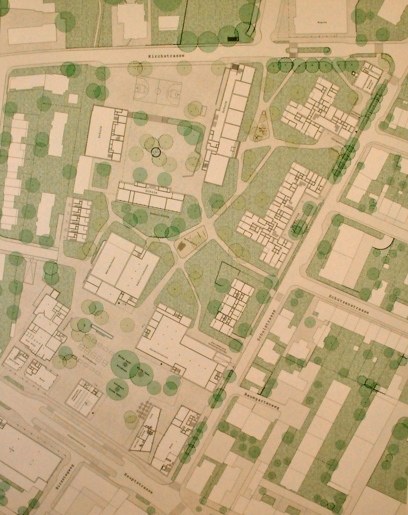 Das Quartier wird durch zwei öffentliche Schwerpunkte geprägt. Es sind dies der Hauptplatz und der Schulhof. Durch die Setzung der Gebäude entstehen diagonal verlaufende Raumabfolgen vom Hauptplatz zum Schulhausplatz. Der „Stadtplatz“ bietet genügend Raum für multifunktionelle Nutzungen. Die Leseart der Verfasser ist so, dass vom Hauptplatz mit dem hohen Stadthaus der Grünanteil im neuen Quartier gegen den Rhein hin stetig zunimmt und immer mehr vom Park zur Landschaft wird. Das Wegnetz führt diagonal durch den neuen Grünraum. Entlang dem