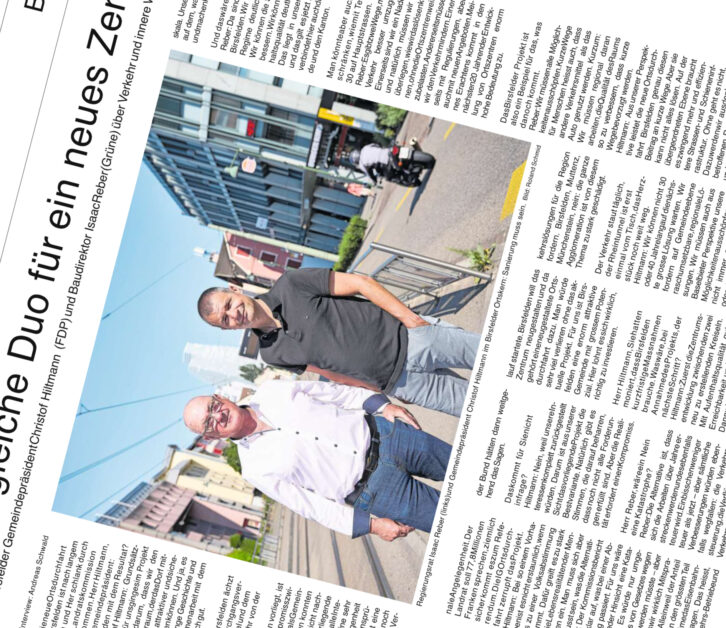 Am 3. Juli 2025, pünktlich in der ersten Schulferienwoche, bringt die bz Basel unter dem Titel »Das ungleiche Duo für ein neues Zentrum« ein Gespräch mit Gemeindepräsident Christof Hiltmann und Regierungsrat Isaac Reber. Sie unterhalten sich bestens über die »Neue Ortsdurchfahrt«.
