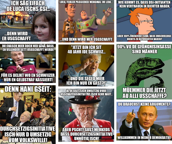 Auf Streifzü­gen durch die Face­book-Kom­men­tar­land­schaften stossen die Aktivis­ten bei den Befür­wortern der Durch­set­zungsini­tia­tive immer wieder auf die gle­ichen Behaup­tun­gen und Argu­mente. Damit diese nicht unkom­men­tiert in der Daten­flut des Inter­nets unterge­hen, haben sie sich entschlossen, die besten der schlecht­en Phrasen mit einem eige­nen Beitrag zu ehren.
