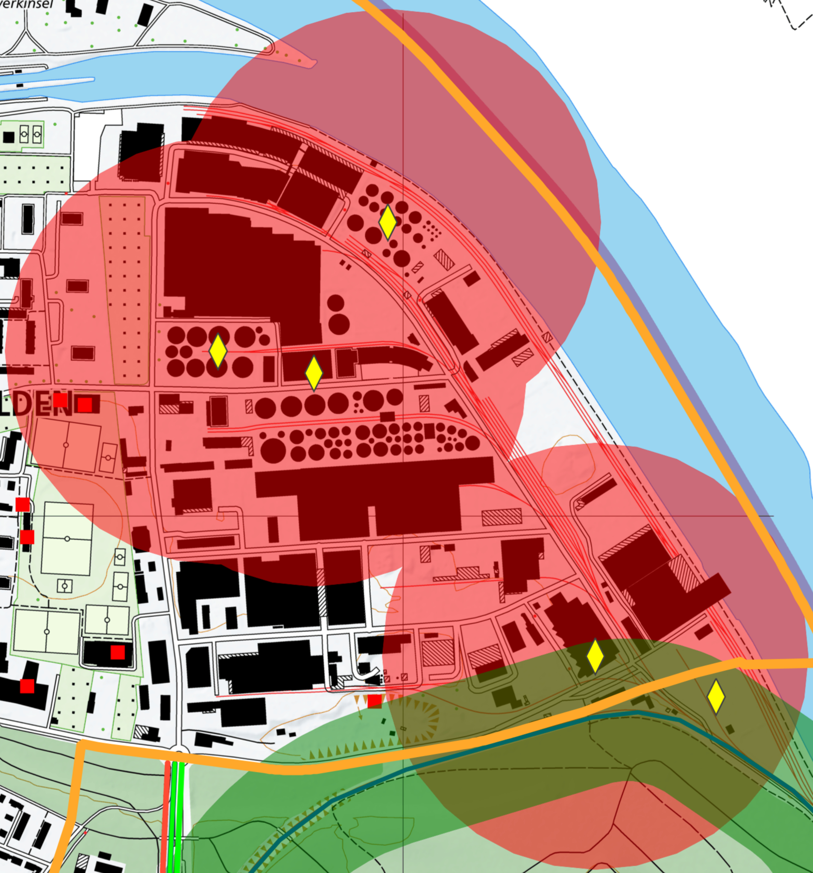 Ent­spre­chend der Grös­se der Anla­gen und der Posi­tio­nie­rung inmit­ten des Lager‑, Pro­duk­ti­ons- und kan­to­na­len Arbeits­ge­bie­tes, ist davon aus­zu­ge­hen, dass von den Anla­gen eine unmit­tel­ba­re Gefahr für die Arbeits­plät­ze im Hafen­pe­ri­me­ter, für die Umwelt (Luft, Was­ser, Nah­erho­lungs­ge­biet) und ins­be­son­de­re für das in Sicht­wei­te lie­gen­de Wohn­ge­biet Ster­nen­feld aus­geht. Eine der vor­lie­gen­den Stör­fall­kar­ten zeigt, dass die Wohn­ge­bie­te west­lich der Ster­nen­feld­stras­se und ein Teil der Sport­an­la­gen stark tan­giert wer­den.