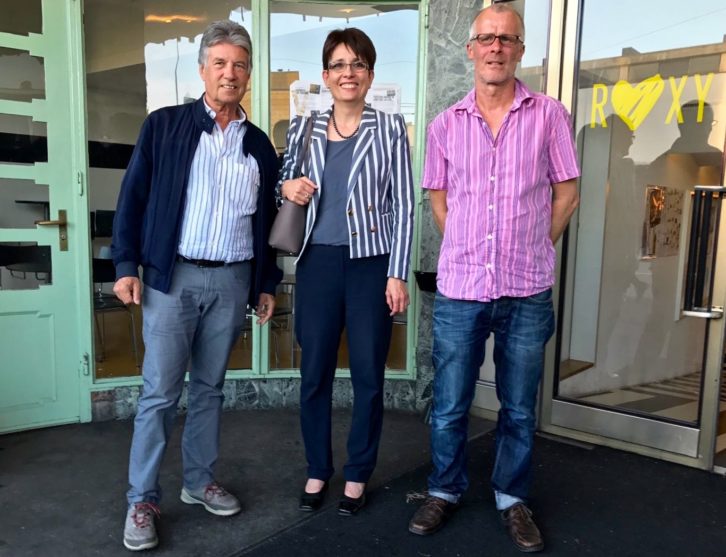 Wäre das ROXY ein Stadion und die Sache wäre Fussball, hiesse die Bildlegende: Präsident Marc Joset verlängert Vertrag mit Sportchef Sven Heier um vier Jahre. In der Mitte, Landratspräsidentin in spe, Elisabeth Augstburger.