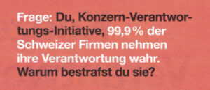 Sie haben heute, 12.11.2020, einen Flyer der Gegner der Konzernverantwortungsinitiative im Briefkasten gehabt. Schon dieser Titel in Form einer Frage ist reiner Stuss. Warum? Ganz einfach: