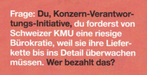 Von der Konzernverantwortungsinitiative sind nur Firmen betroffen, die in anderen Ländern gegen Menschenrechte und Umweltstandards verstossen. Wenn uns nun die Gegener sagen, dass 80’000 Firmen betroffen sind, heisst das ja, dass 80’000 Schweizer Firmen gegen Menschenrechte und Umweltstandards verstossen. Als Schweizer Firma würde ich mich dagegen vehement wehren!