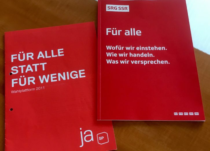 Links (natür­lich!), ist die SP-Wahl­platt­form von 2011 zu sehen, rechts die neu­es­te SRG-Bro­schü­re, Sep­tem­ber 2016. Wie sich die Titel glei­chen!